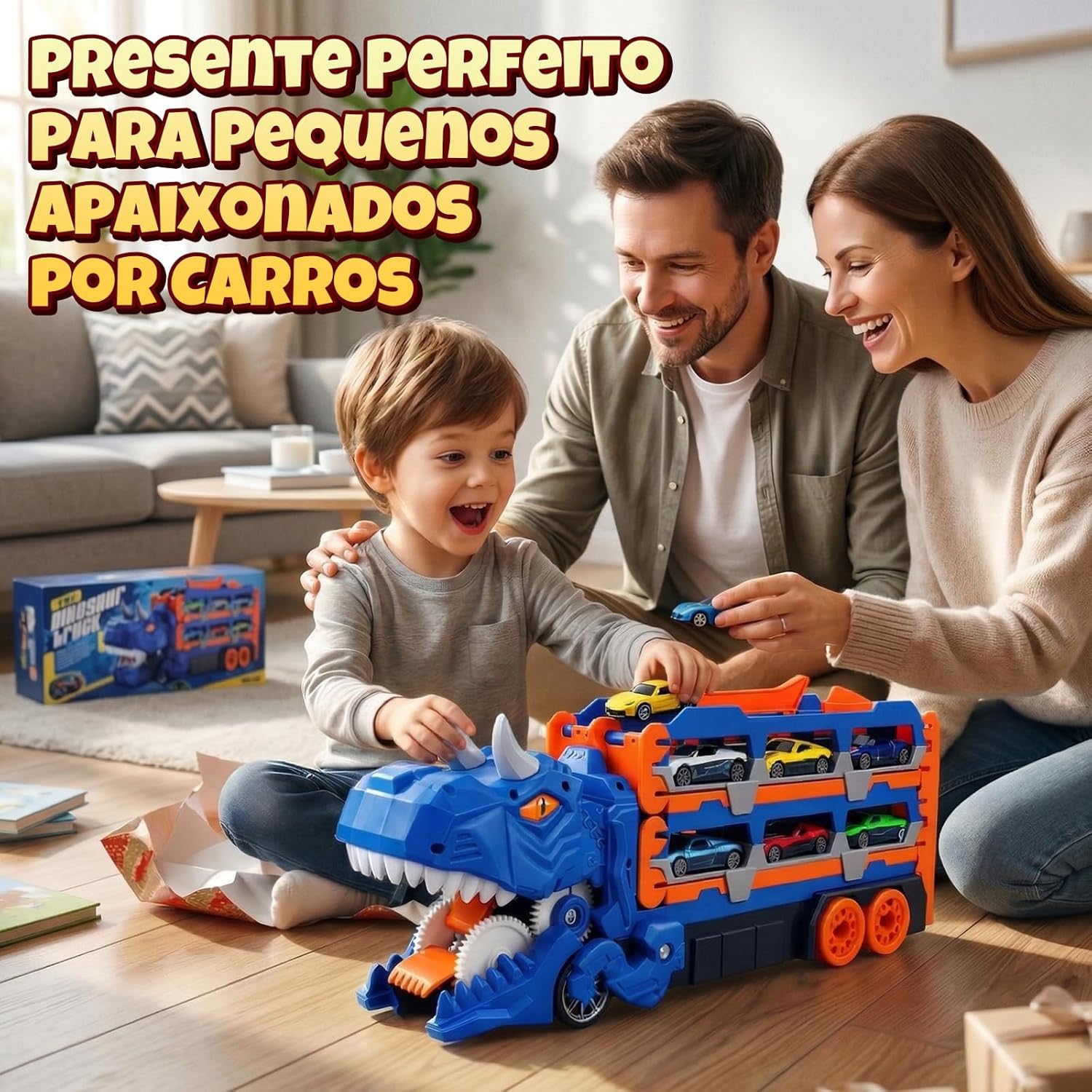 Este caminhão de brinquedo infantil vai muito além do que os olhos veem: ao empurrar, ele engole os carrinhos que encontra pela frente! Além disso, transforma-se em uma pista dupla de 145 cm para corridas emocionantes. É um dinossauro brinquedo 3 em 1 que surpreende a cada brincadeira – perfeito para crianças a partir de 3 anos.