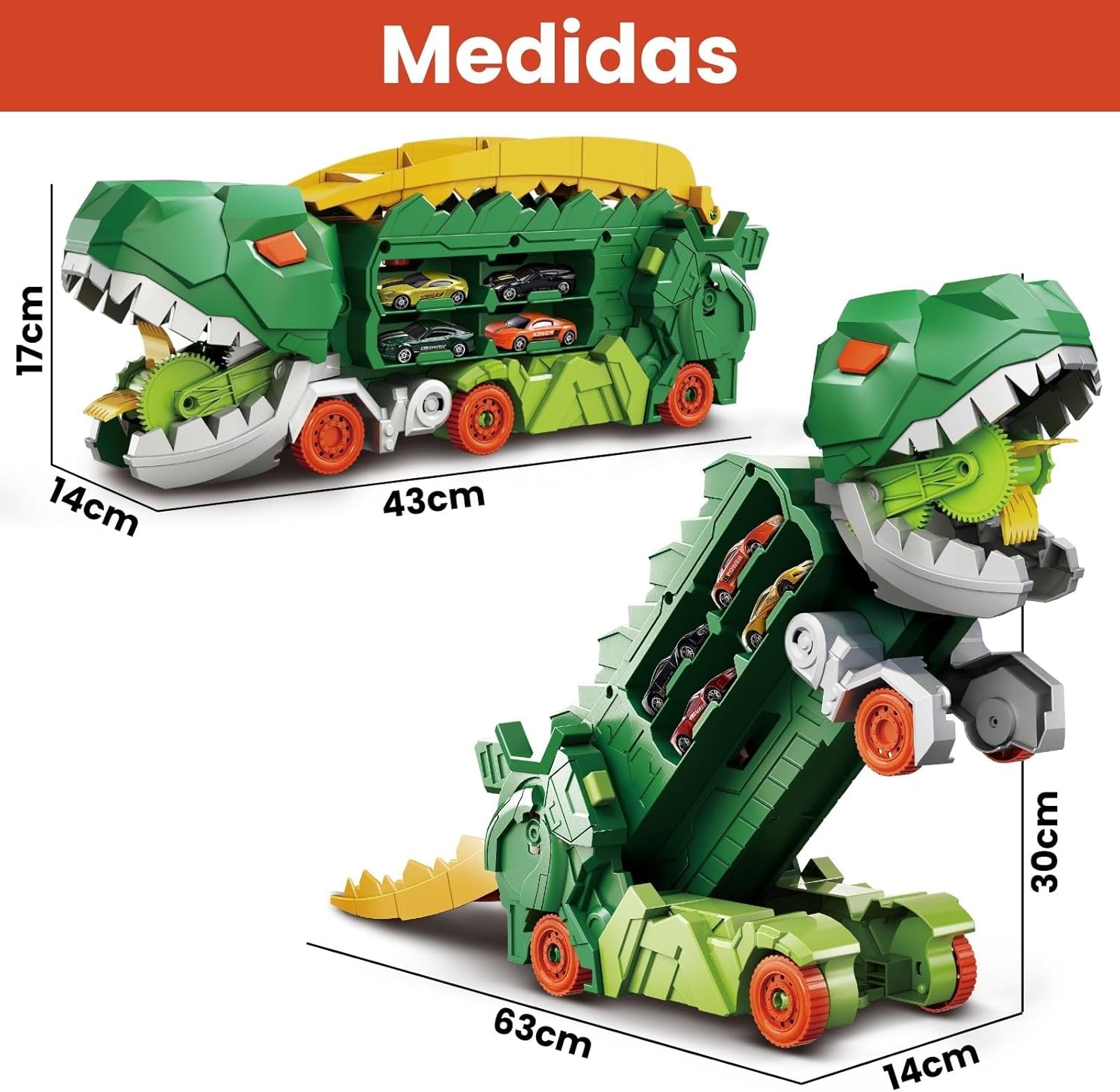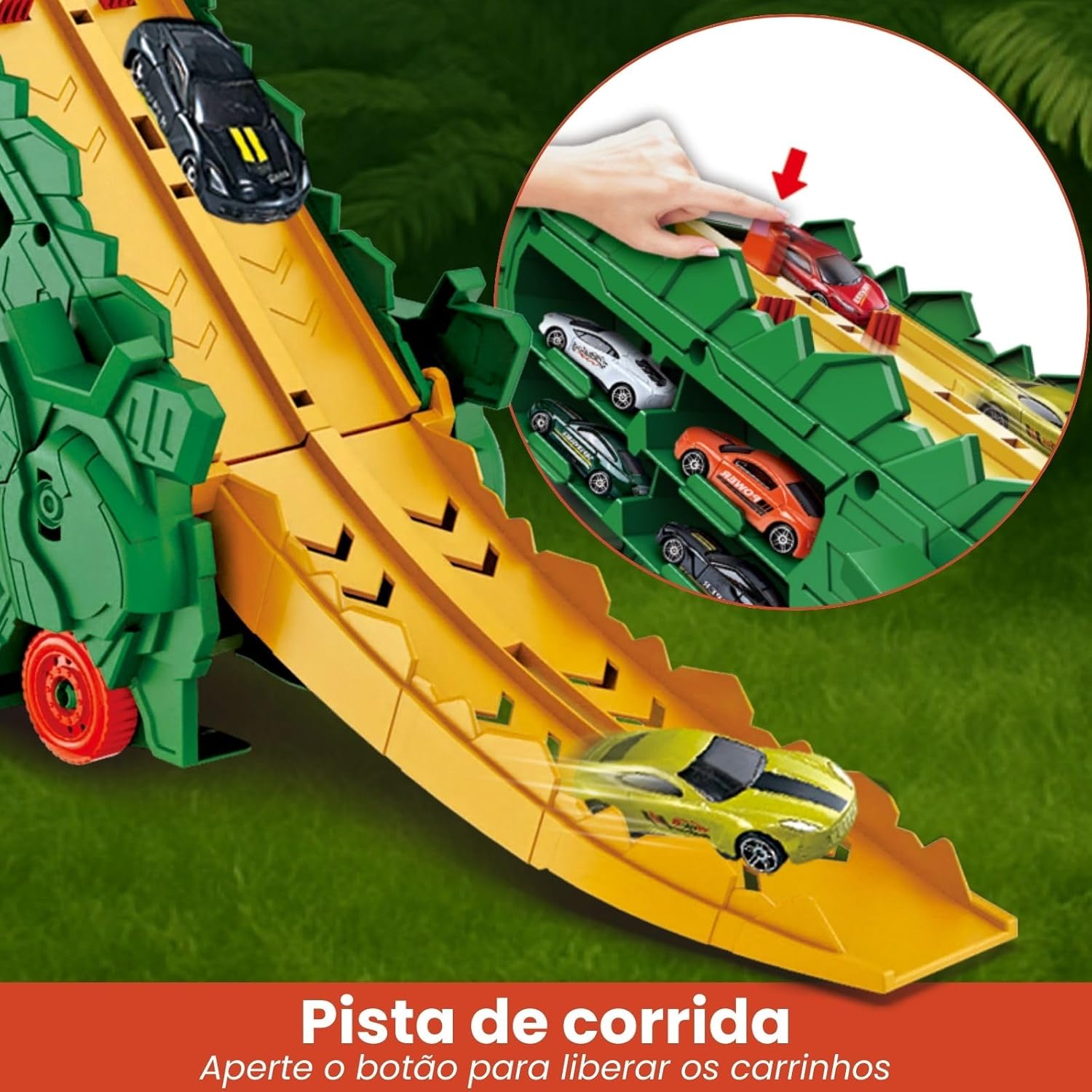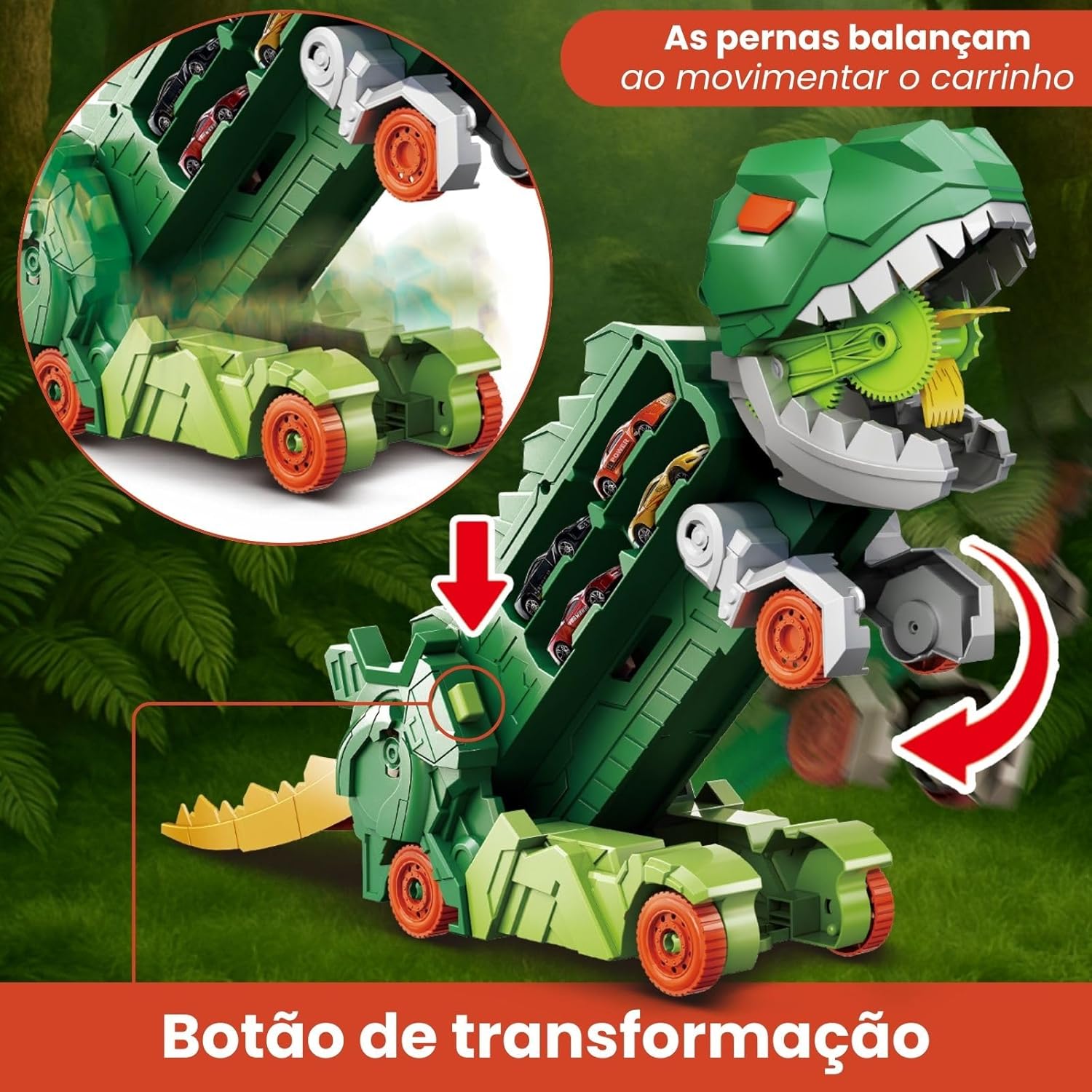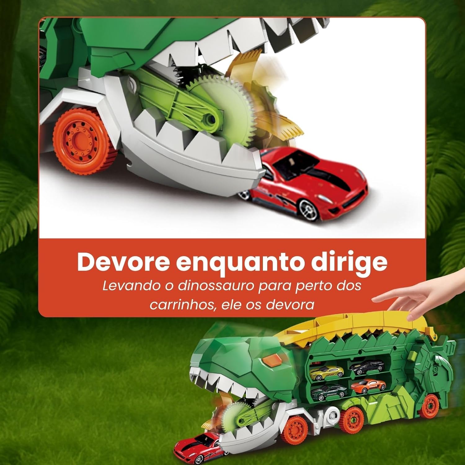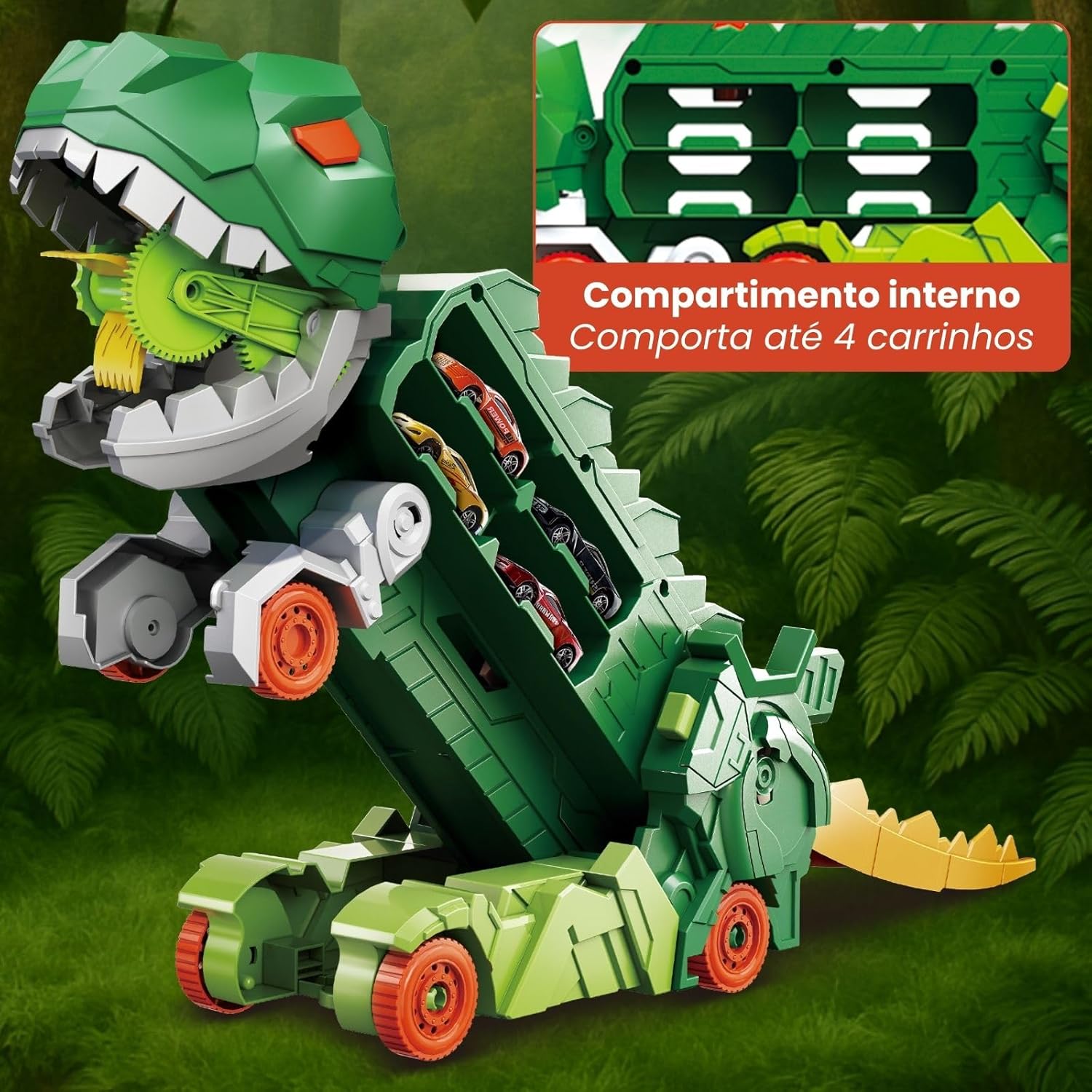 Diversão com Funcionalidade: O dinossauro “devora” carrinhos pela frente e os libera pela traseira, além de suportar até 18 carrinhos.