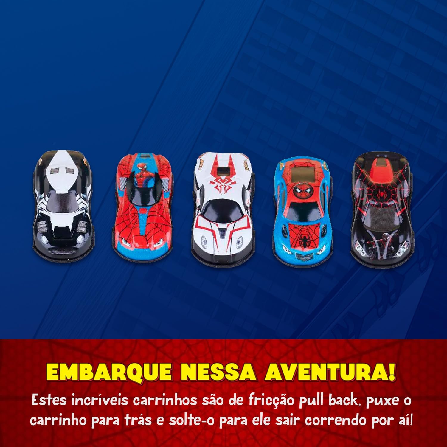 DIVERSÃO SOBRE RODAS. O kit de Mini Veículos Pull Back Avengers traz carrinhos inspirados nos grandes heróis da Marvel, como Homem de Ferro, Capitão América, Homem Aranha, Hulk e Pantera Negra.