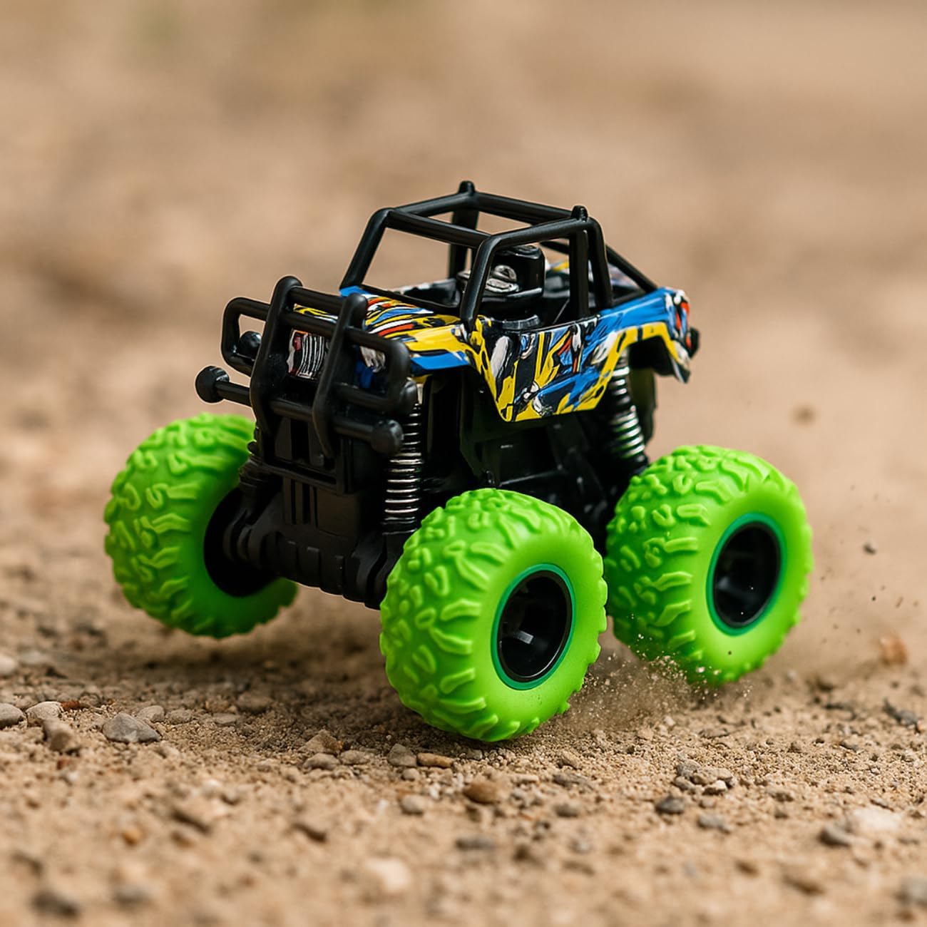 DESIGN ROBUSTO: Carros Monstro Truck com estrutura resistente, rodas grandes verdes e suspensão móvel para máxima diversão e durabilidade