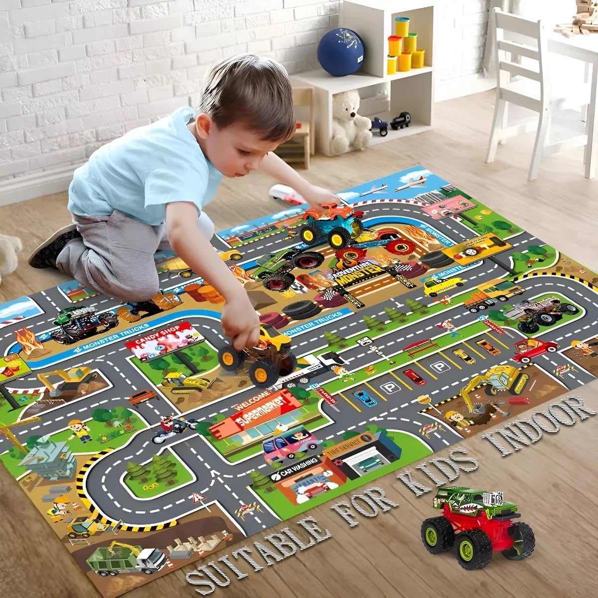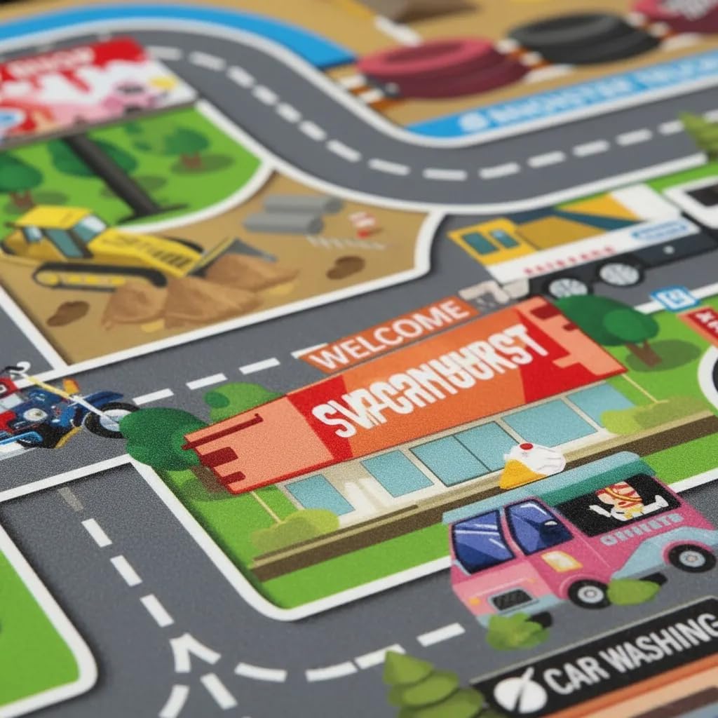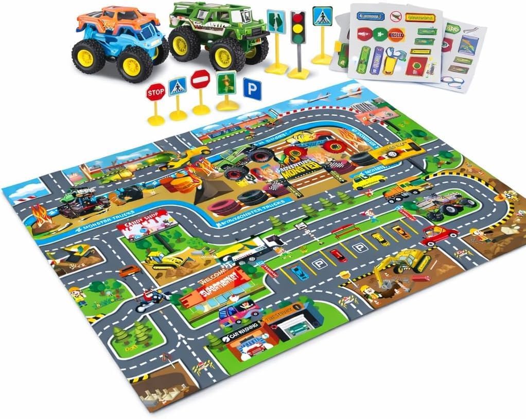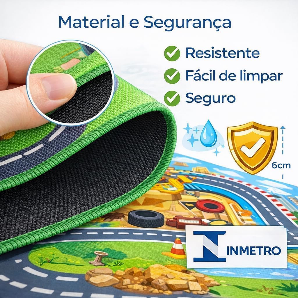 Diversao criativa e educativa para as criancas explorarem o mundo da imaginacao. O conjunto de carrinhos com tapete ilustrado transforma qualquer ambiente em uma pequena cidade, com ruas, pistas e cenarios urbanos que estimulam o faz de conta e a interacao durante as brincadeiras. O brinquedo acompanha carrinhos e acessorios de transito que tornam a experiencia ainda mais interativa, incentivando o raciocinio criativo e o desenvolvimento da coordenacao motora. Produzido com materiais resistentes e acabamento colorido, e facil de limpar e seguro para o uso infantil. ESPECIFICACOES: Material: plastico e tecido sintetico | Idade: +3 anos | Tapete: 80x70cm | Peso: 300g | Certificacao INMETRO: CE-BRI/INNAC 02264-01A. ITENS INCLUSOS: 01 Tapete ilustrado, 02 Carrinhos, 01 Kit acessorios de transito, 01 Kit adesivos.