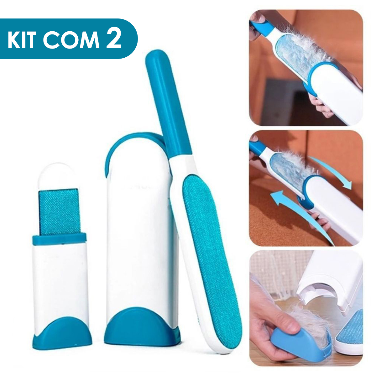 Escova Tira Pelos Pet Fur Removedora Roupa Sofá Removedor de pêlos de alta tecnologia, auto limpante, é uma escova de dupla face, extra grande, remove o pêlo e os fiapos duas vezes mais rápido do que uma escova comum, indispensável pra você que tem um pet peludo! Basta inserir a escova na base de auto limpação que ela será totalmente limpa como num passe de mágica, removendo todos os pelos da escova, armazenando-os na base. Após a limpeza completa basta remover a base e jogar os pelos no lixo. Dimensões aproximadas do produto: Comprimento 30 Cm Largura 5,5 Cm Itens Inclusos na Embalagem: – 02x Removedor de Pelos