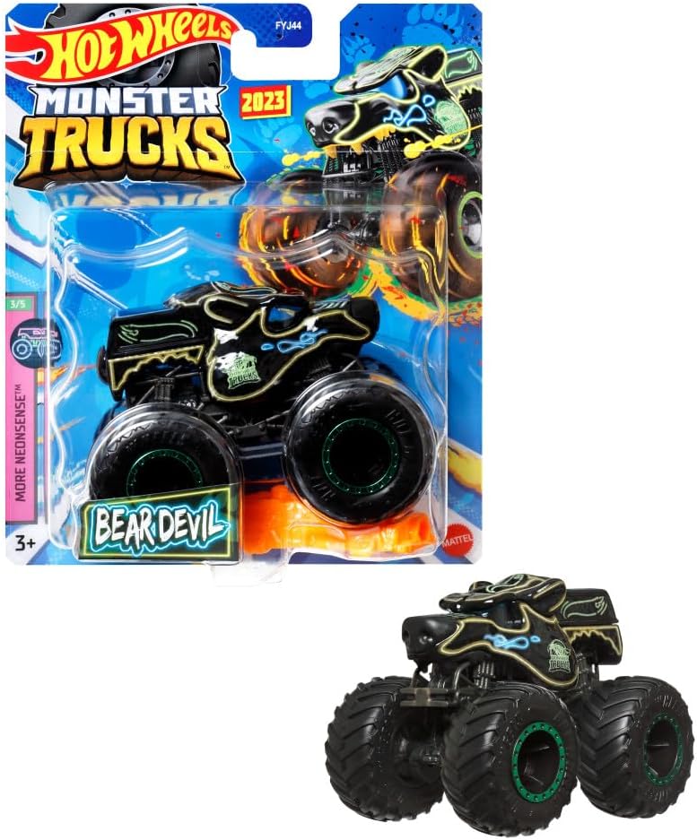 Monster Trucks die-cast em escala 1:64 com designs impressionantes, gráficos detalhados e pneus gigantes para uma ação incrível de esmagamento e colisão.
