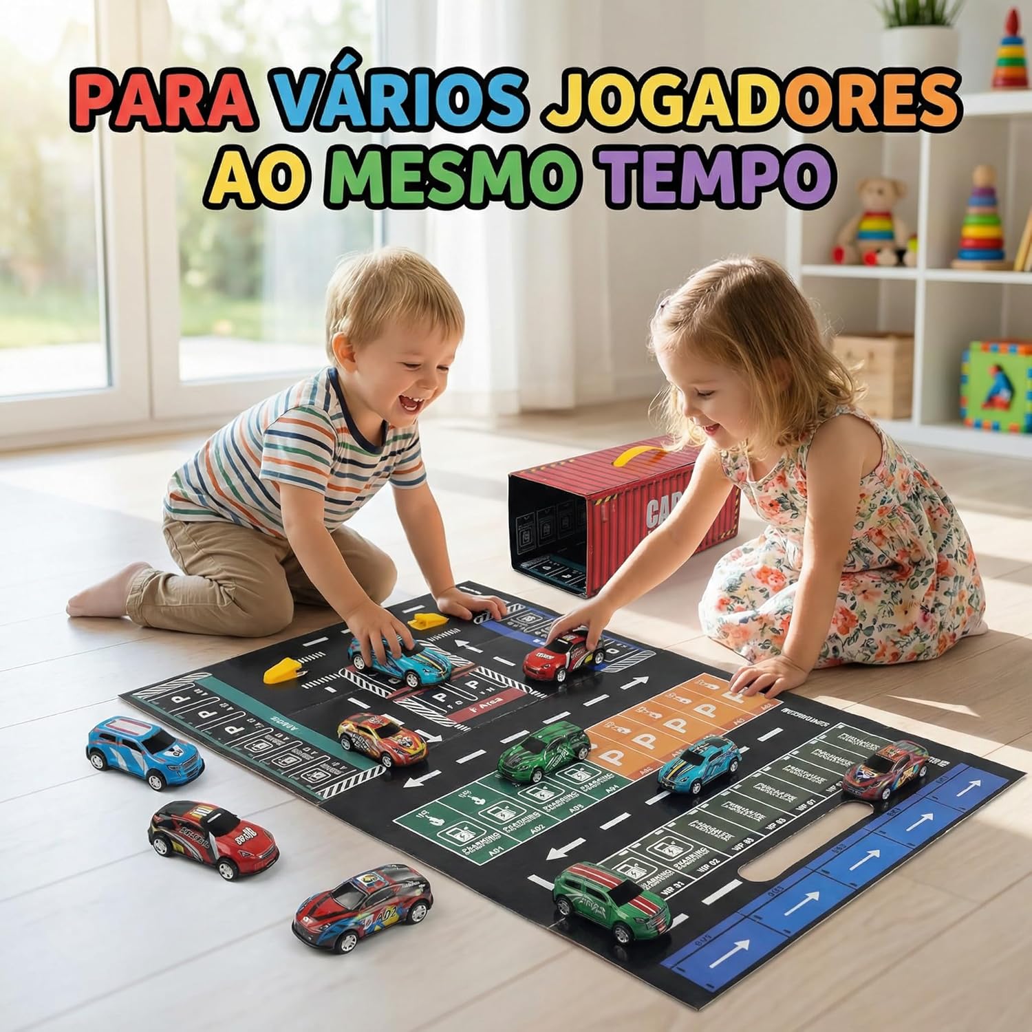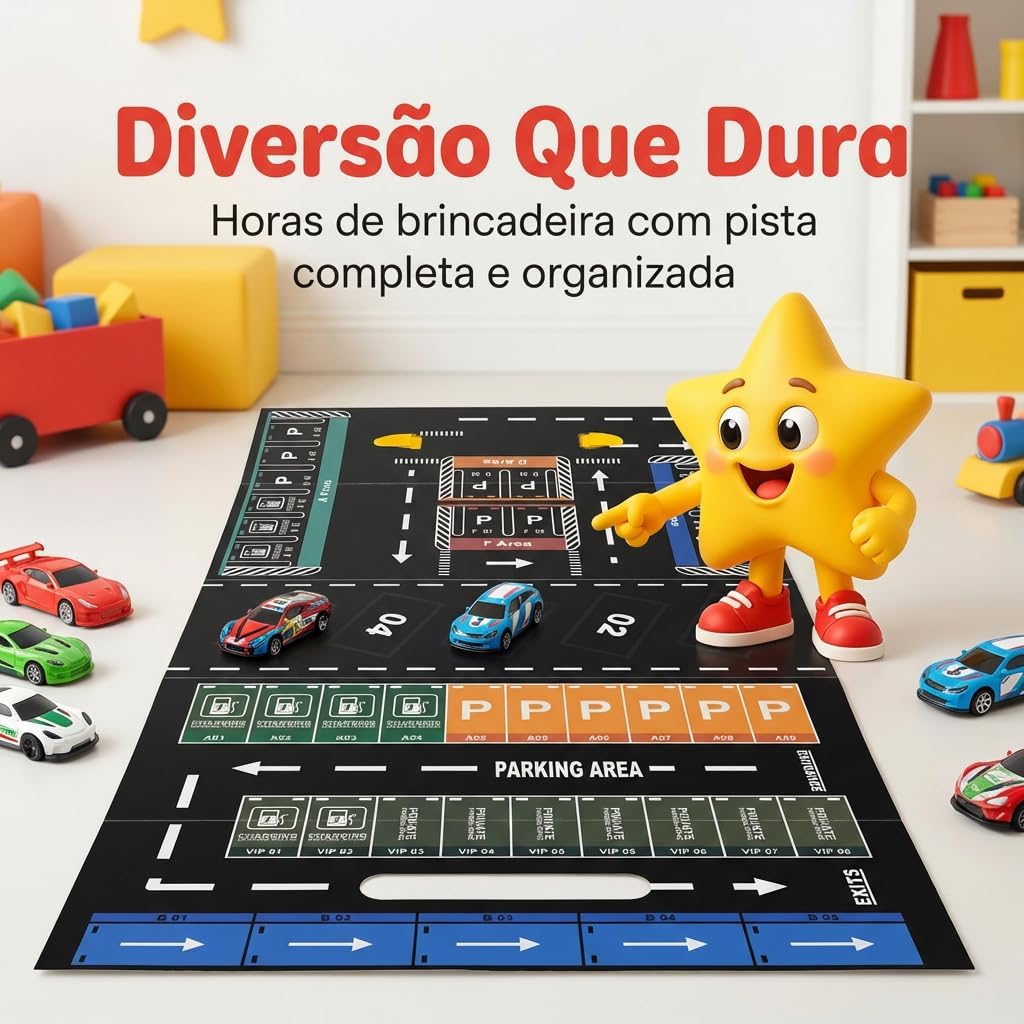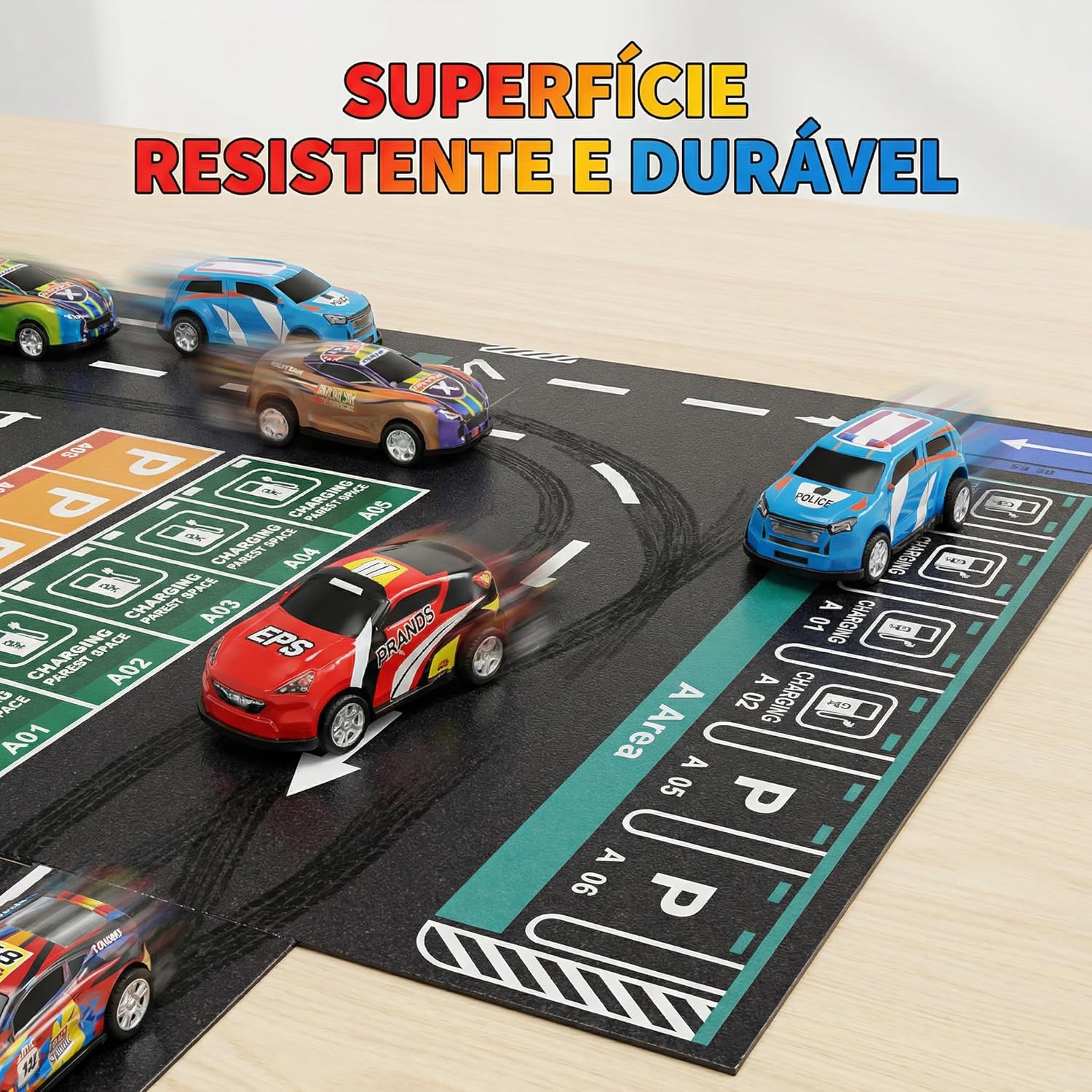 🗺️ TAPETE DE JOGO INTEGRADO: A embalagem se transforma ou acompanha um tapete de atividades com design de cidade/pistas. É o cenário perfeito para usar sobre o tapete de atividades bebê ou no chão da sala, criando um mundo de aventuras imediato.