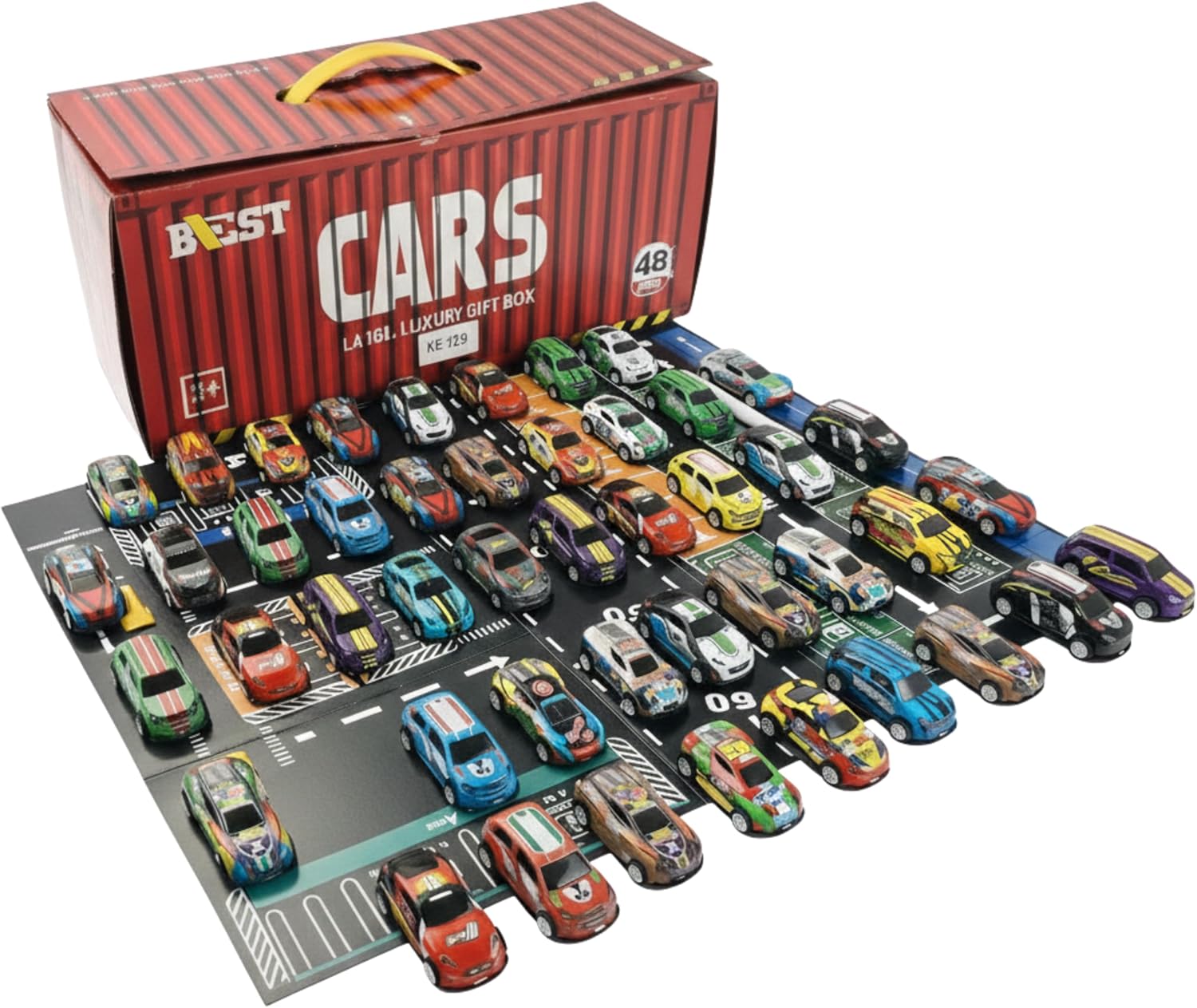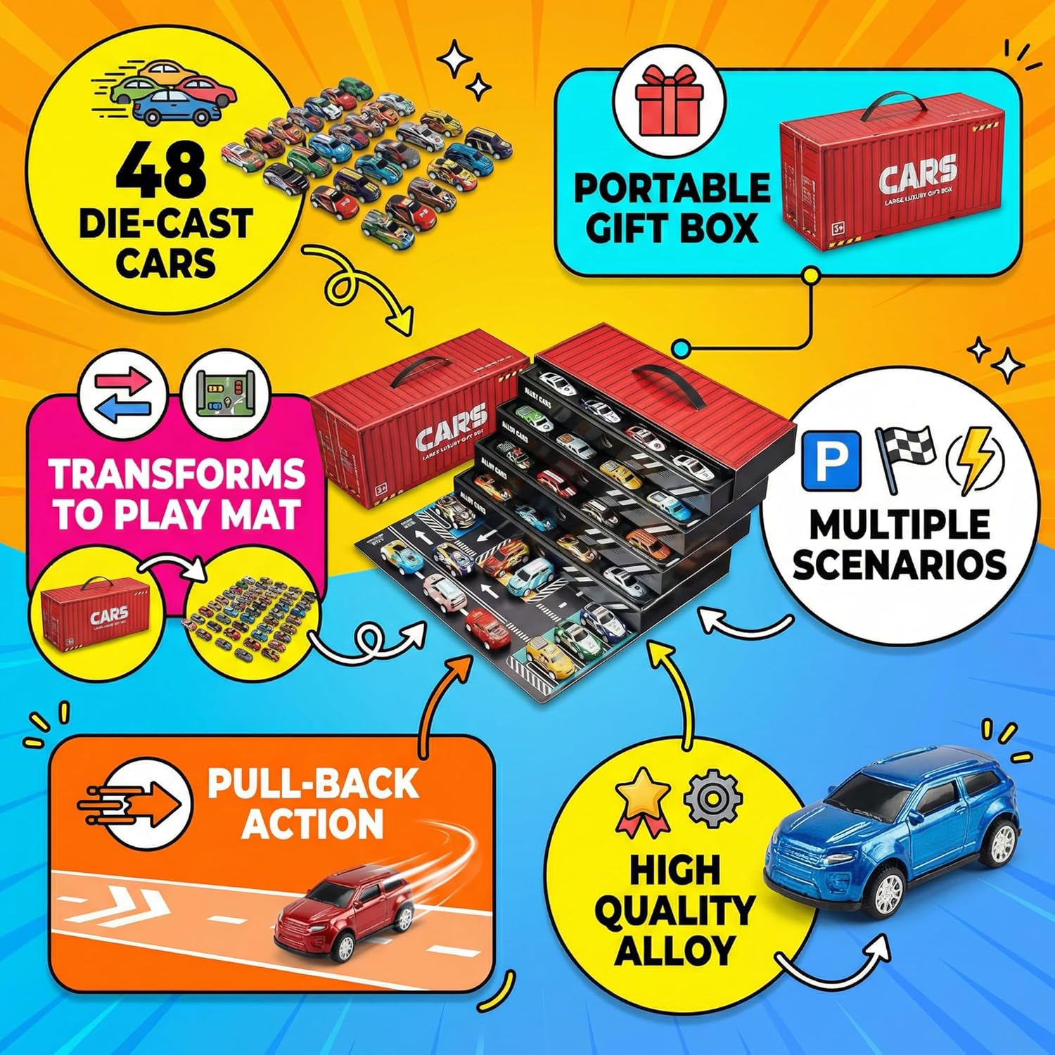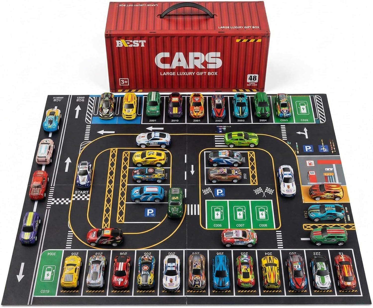 🏎️ COLEÇÃO GIGANTE DE 48 CARRINHOS: Uma frota completa de uma só vez! Este set inclui 48 veículos die cast com designs variados, garantindo que a criança tenha opções infinitas para corridas e exibições, superando qualquer carrinho brinquedo individual.