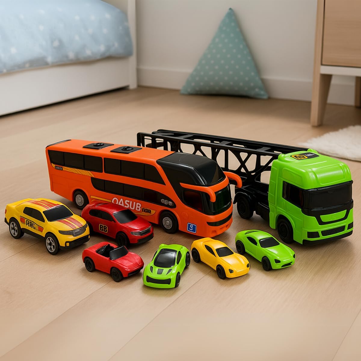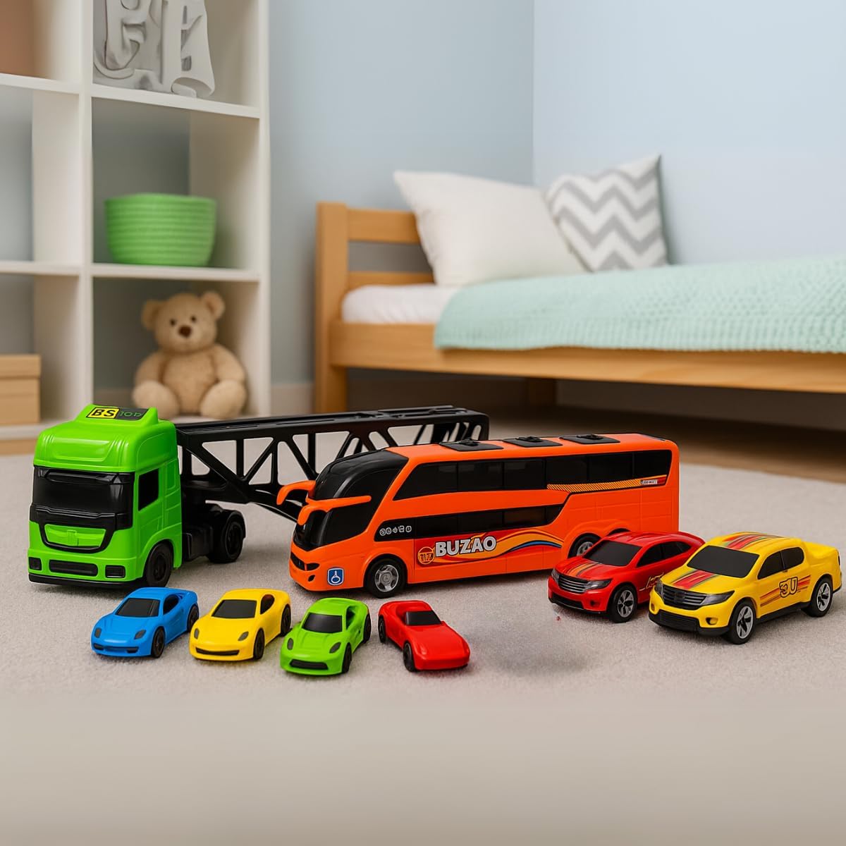 DESIGN COLORIDO: Veículos em cores vibrantes como verde, laranja, amarelo, vermelho e azul, com detalhes realistas e acabamento de alta qualidade