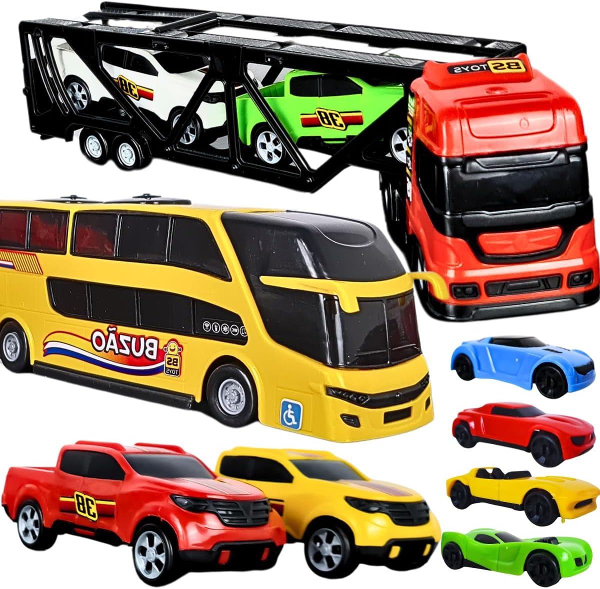 CONJUNTO COMPLETO: 1 caminhão cegonheiro (34×9 cm) 1 ônibus de dois andares (26×6 cm) 2 pick-ups (12×5 cm) 4 carrinhos (6×4 cm)
