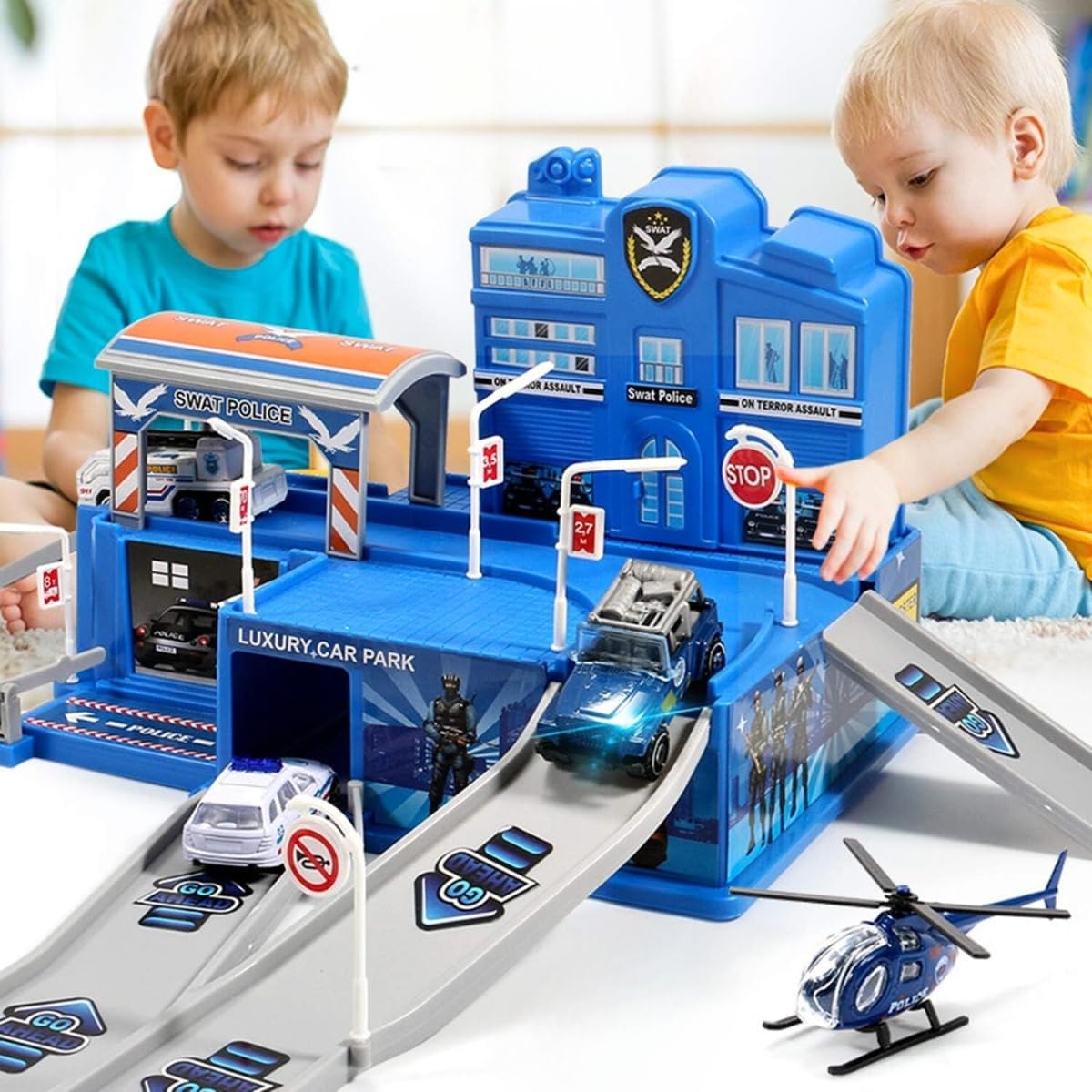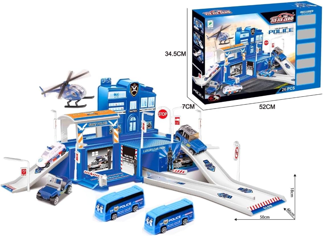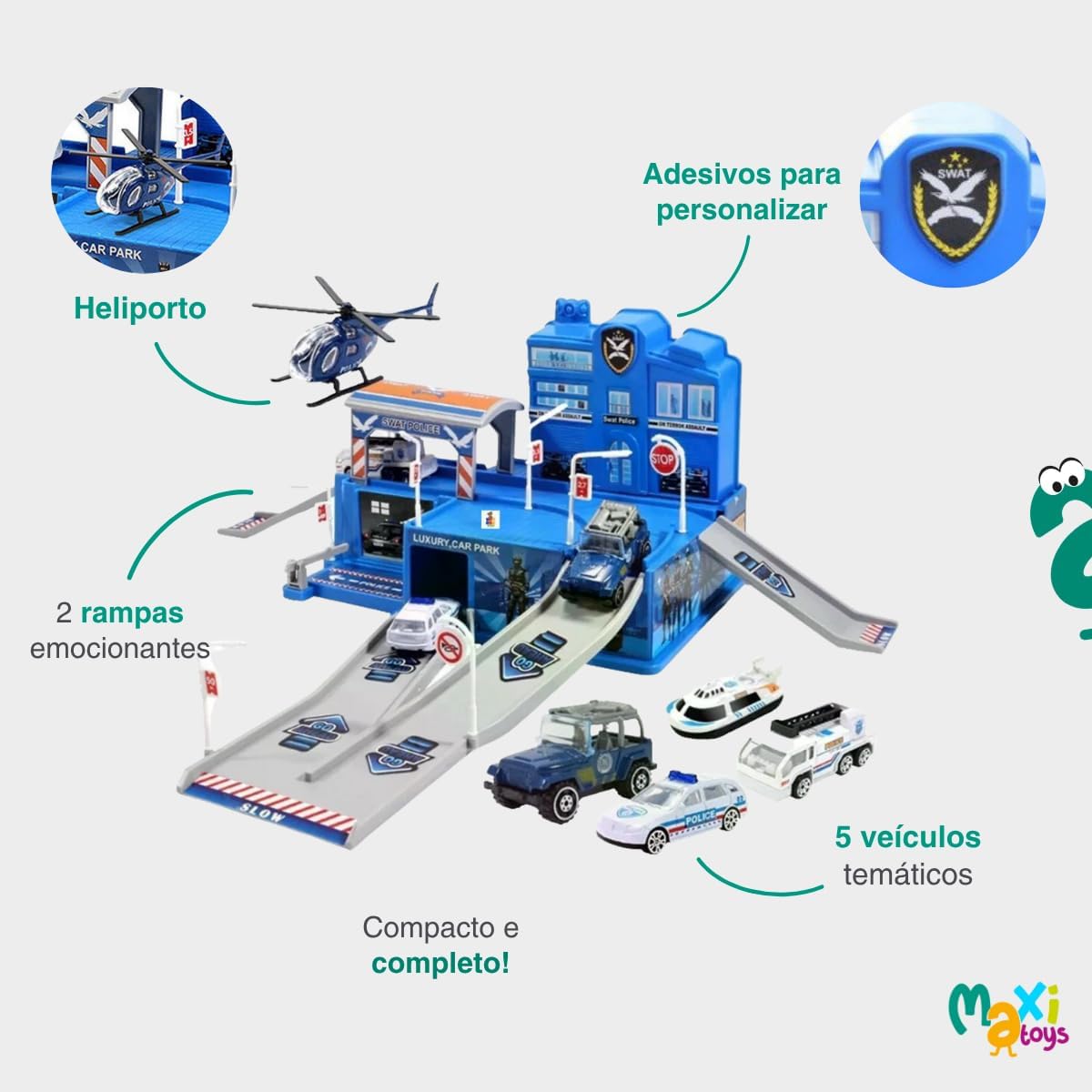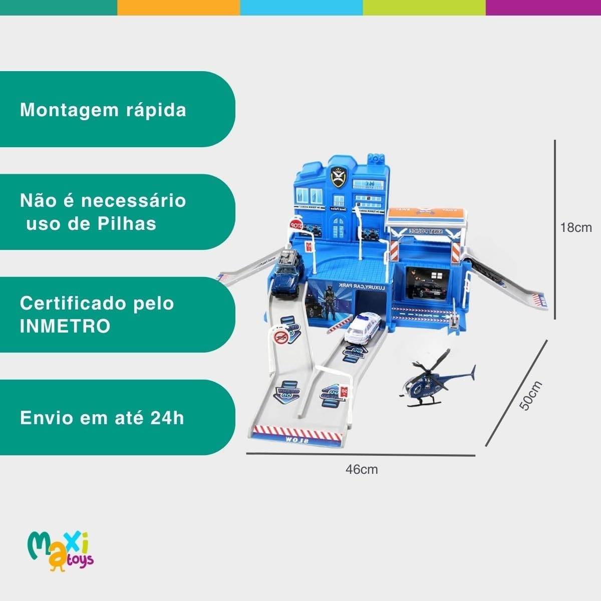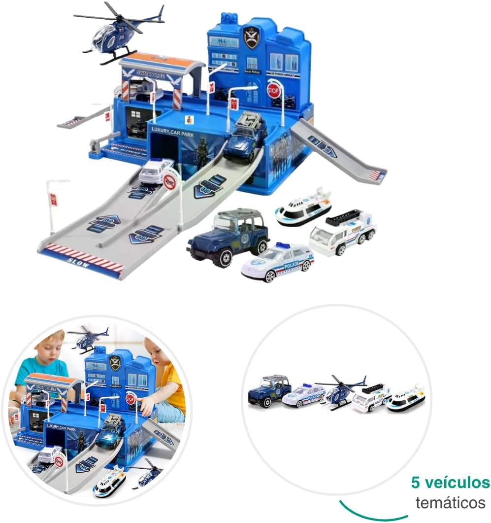 – Acompanha 5 Veículos: 2 ônibus de plástico, 2 carros de liga leve, 1 helicóptero + Acessórios
