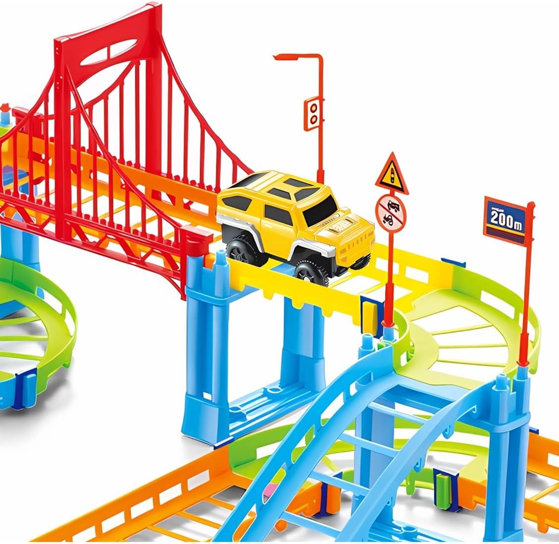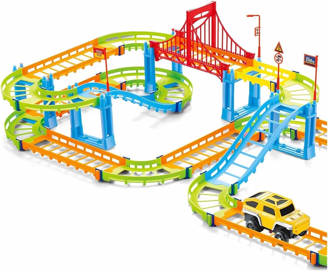 DESIGN DIVERTIDO: Sistema de trilhos com múltiplos níveis, curvas emocionantes e uma ponte impressionante que proporciona horas de diversão