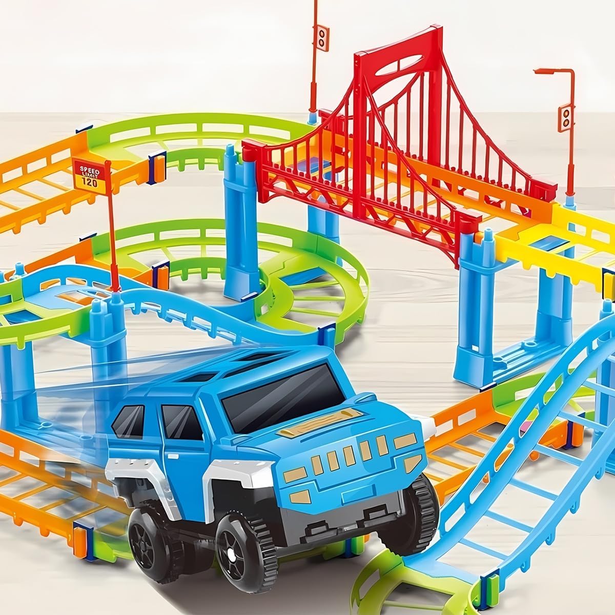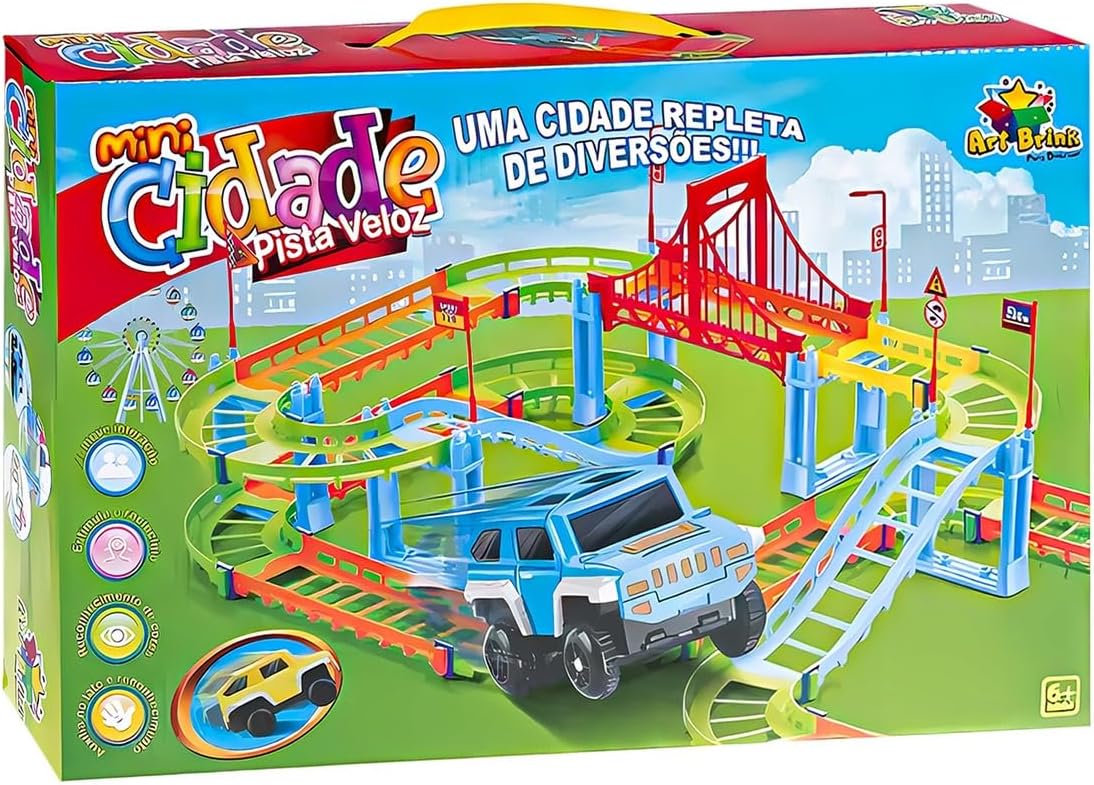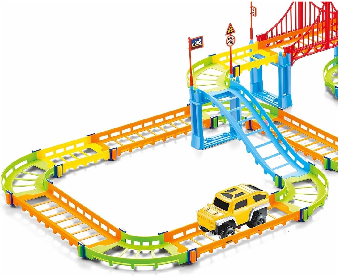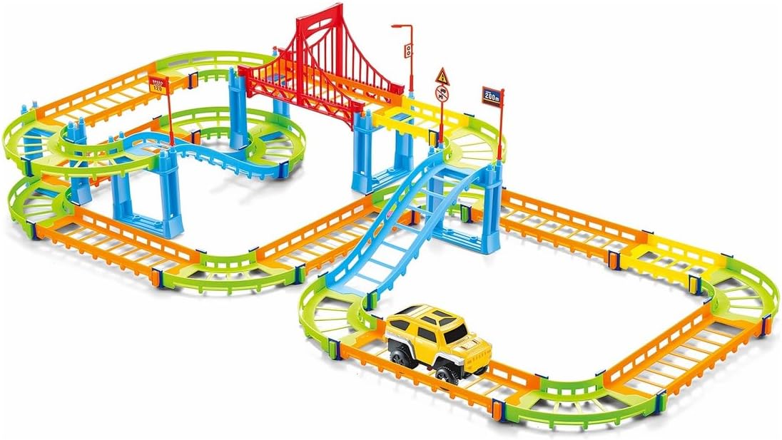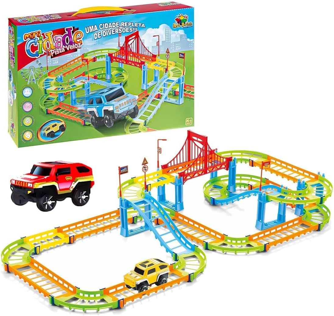 Desperte a imaginação do seu pequeno com esta incrível pista de corrida infantil! O conjunto completo inclui uma pista colorida e versátil com trilhos em azul, verde, laranja e vermelho, apresentando curvas emocionantes, subidas desafiadoras e uma impressionante ponte suspensa. O kit vem com um carrinho robusto movido a pilha que percorre toda a extensão da pista com facilidade. A montagem é intuitiva e divertida, permitindo diferentes configurações para horas de diversão. Os elementos incluem 12 seções de trilhos curvos verdes, 8 seções retas amarelas, 2 seções de ponte vermelha, 5 suportes azuis e diversos acessórios complementares que garantem uma experiência de jogo completa. Este brinquedo educativo estimula a coordenação motora, raciocínio espacial e criatividade das crianças enquanto se divertem. A pista montada oferece um circuito repleto de aventuras, perfeito para momentos de diversão em família ou com amigos. As peças são resistentes e projetadas especialmente para o público infantil.