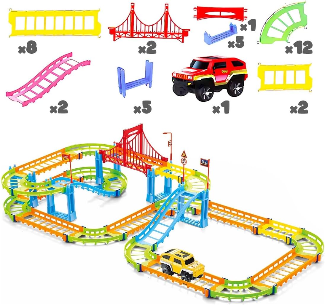 CONJUNTO COMPLETO: Pista de corrida infantil com ponte, incluindo carrinhos, trilhos coloridos em azul, verde, laranja e vermelho, e diversos acessórios para montagem